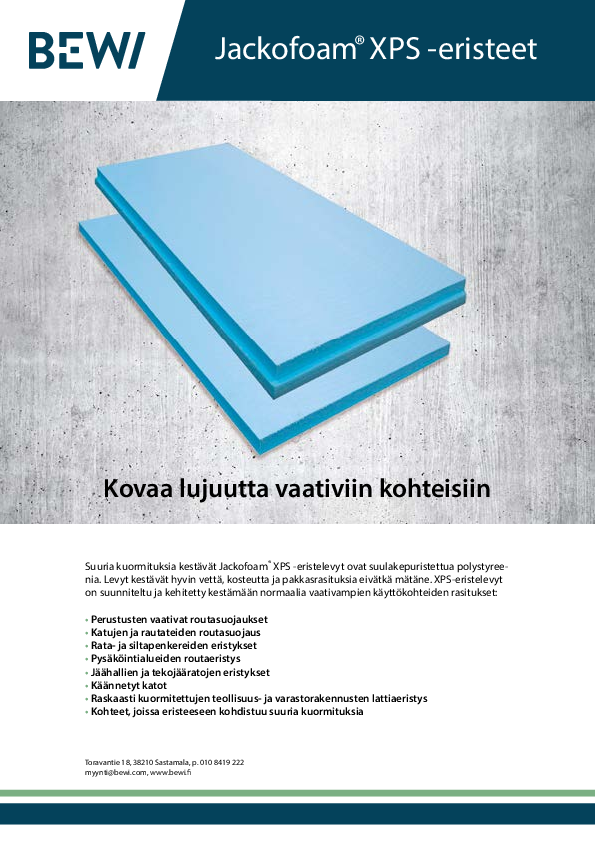 Jackofoam XPS-eristeet on suunniteltu kestämään suuria kuormituksia ja sopivat erinomaisesti mm. routasuojaukseen ja sisä- ja ulkorakentamisen eristämiseen. Lue lisää tuotteesta valmistajan sivuilta